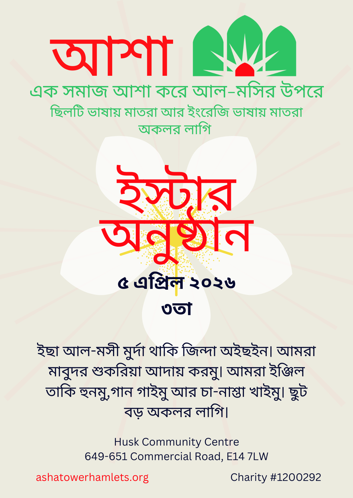 আমরা অইলাম ইছা মছীর অনুসারী ইস্ট লন্ডনর এক সমা। আমার বিভিন্ন জাত, সম্প্রদায় আর ধর্মিয় ইমান তাকি এখানো অইছি আর ইছা আল মছীর গেছ তাকি বকত ফাইছি। এর দায় আমারা তান তালিম আর যতো বরকত অক্কল রকমর মাইনষরে জানাইতে ছাই,অইলে যে যেখান তাকি আইতা ফারইন। তাইন ছিলটি অইতা ফারইন বা অন্য কুনো পরিস্থিতির অইতা ফারইন।